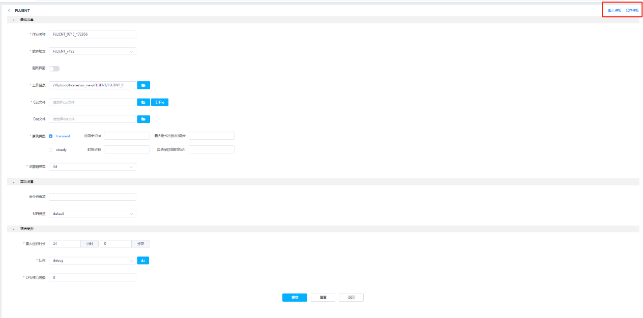 3.作业提交页面如下图,填写FLUENT作业相关运行参数,点击提交按钮即可